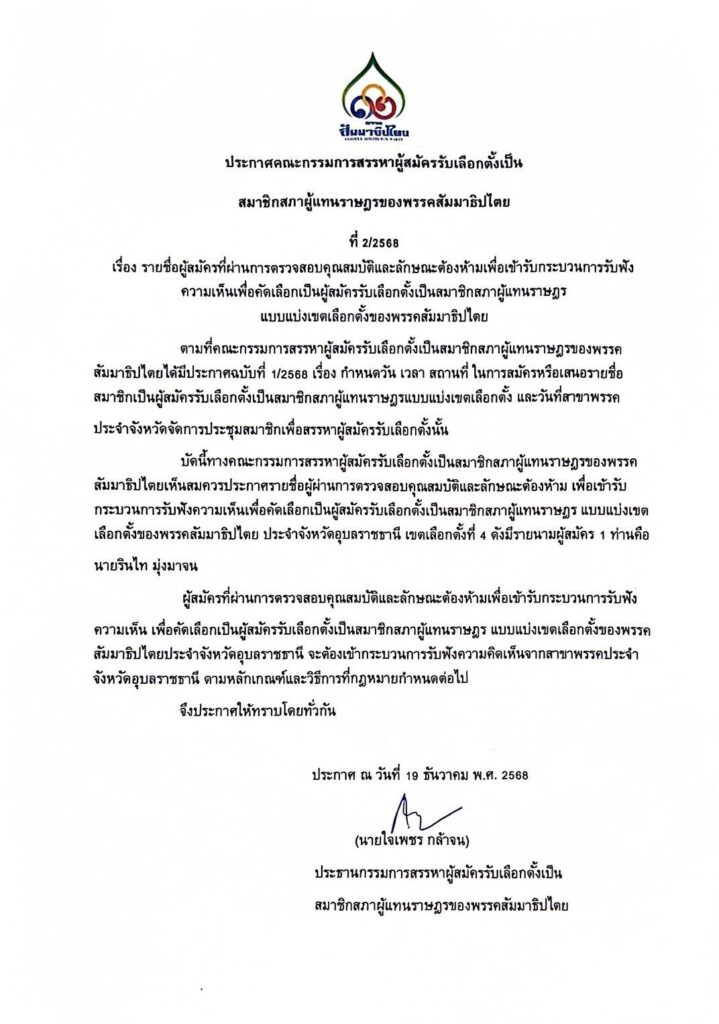 ประกาศคณะกรรมการสรรหาผู้สมัครรับเลือกตั้งเป็นสมาชิกสภาผู้แทนราษฎรของพรรคสัมมาธิปไตย ที่ 2/2568 โปรดอ่านรายละเอียดได้ตามไฟล์รูปในข่าวนี้